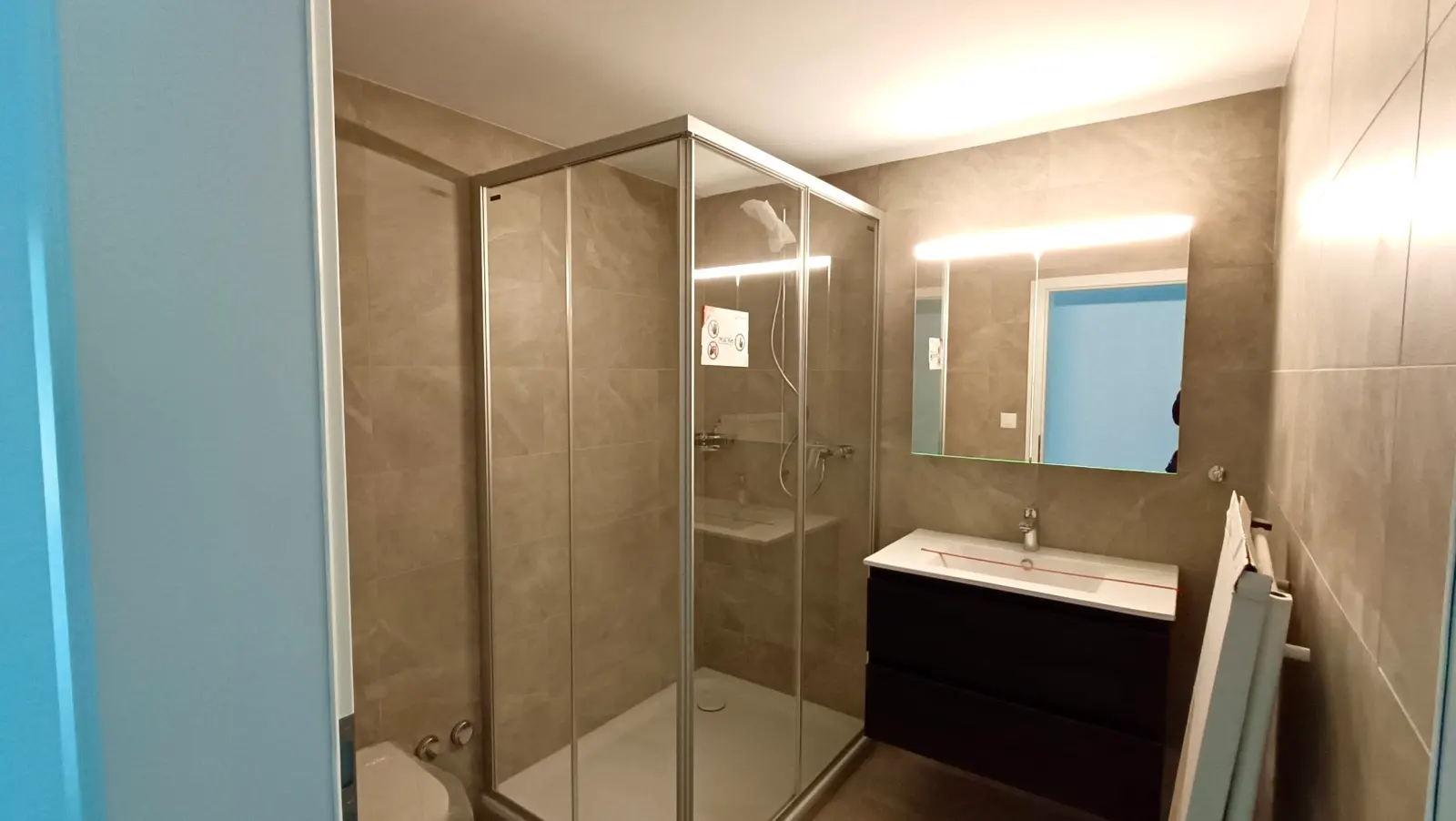 Transformation complète d’une salle de bain avec douche vitrée, mobilier moderne et finitions élégantes pour un espace à la fois fonctionnel et contemporain.