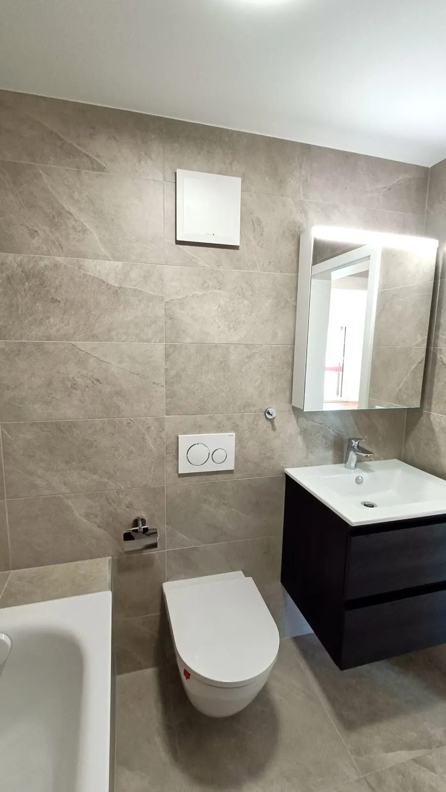 Transformation complète d’une salle de bain avec baignoire, mobilier moderne et finitions élégantes pour un espace à la fois fonctionnel et contemporain.