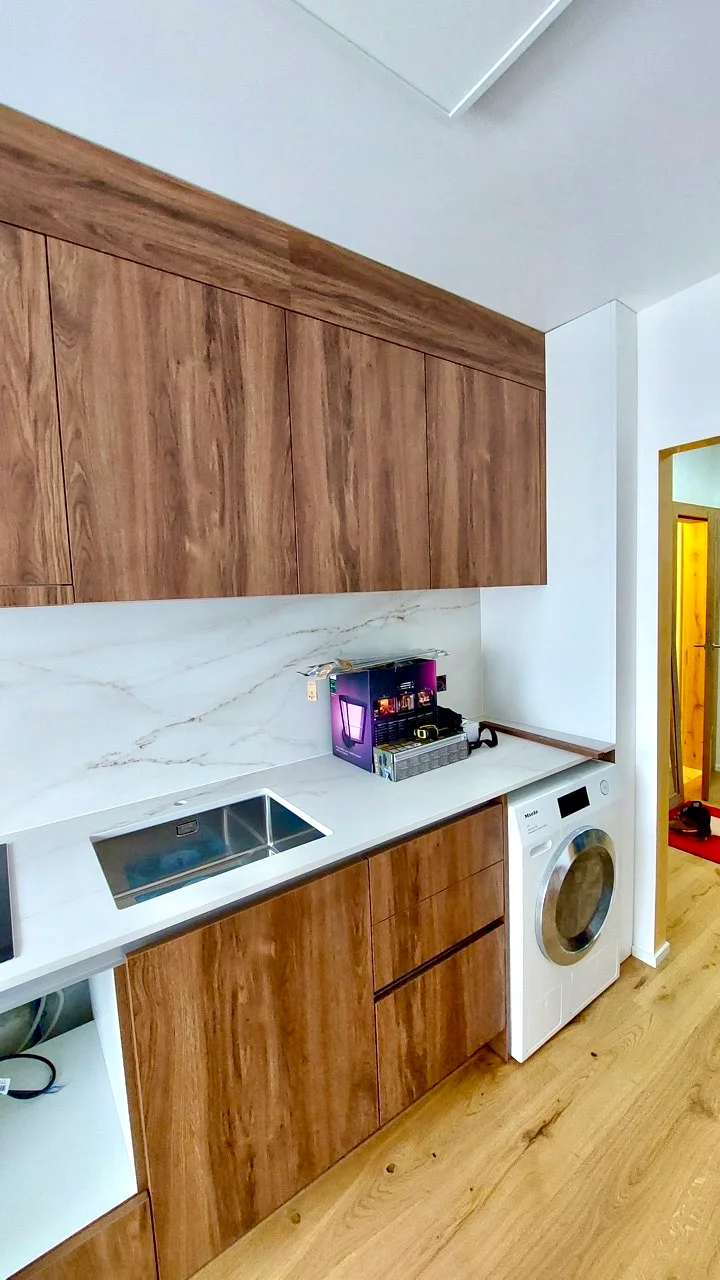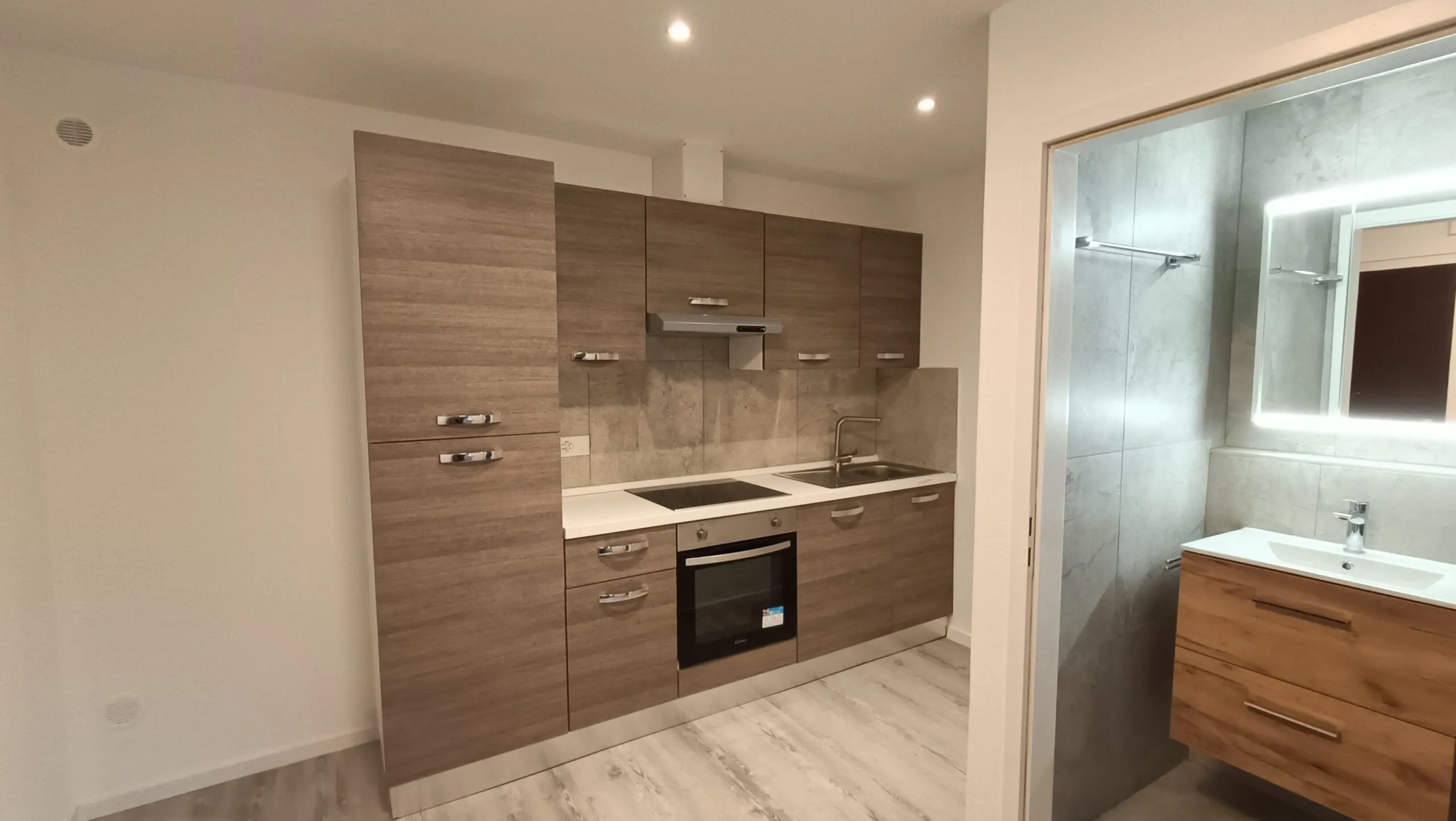 Rénovation complète d'un 2.5 pièces à Fribourg. Pose de parquet, nouvelle cuisine, électricité, fenêtres triple vitrage et salle de bain. Réalisation GoldenHome.