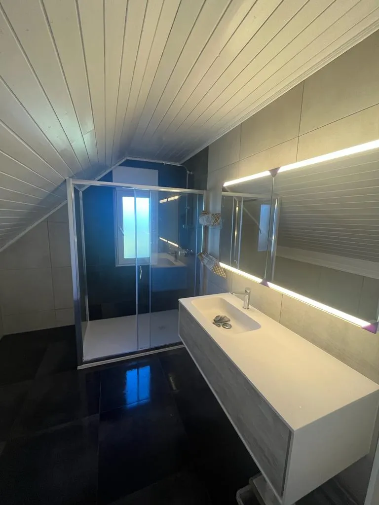 Transformation d’une chambre en salle de bain secondaire moderne. Aménagement pratique avec douche à l’italienne, rangements optimisés et design épuré pour s’intégrer harmonieusement dans la villa.