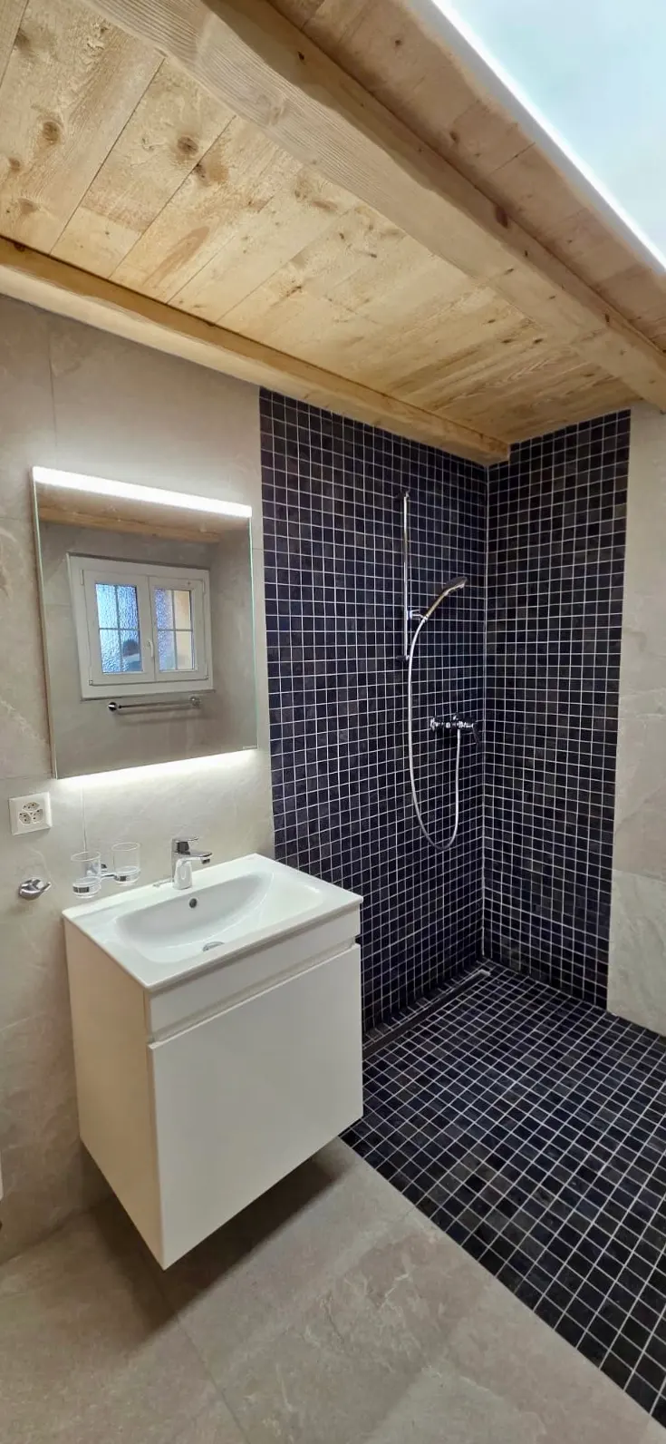 Focus sur cette transformation complète : alliance élégante du carrelage anthracite et du bois massif, intégrant une spacieuse douche à l'italienne vitrée.