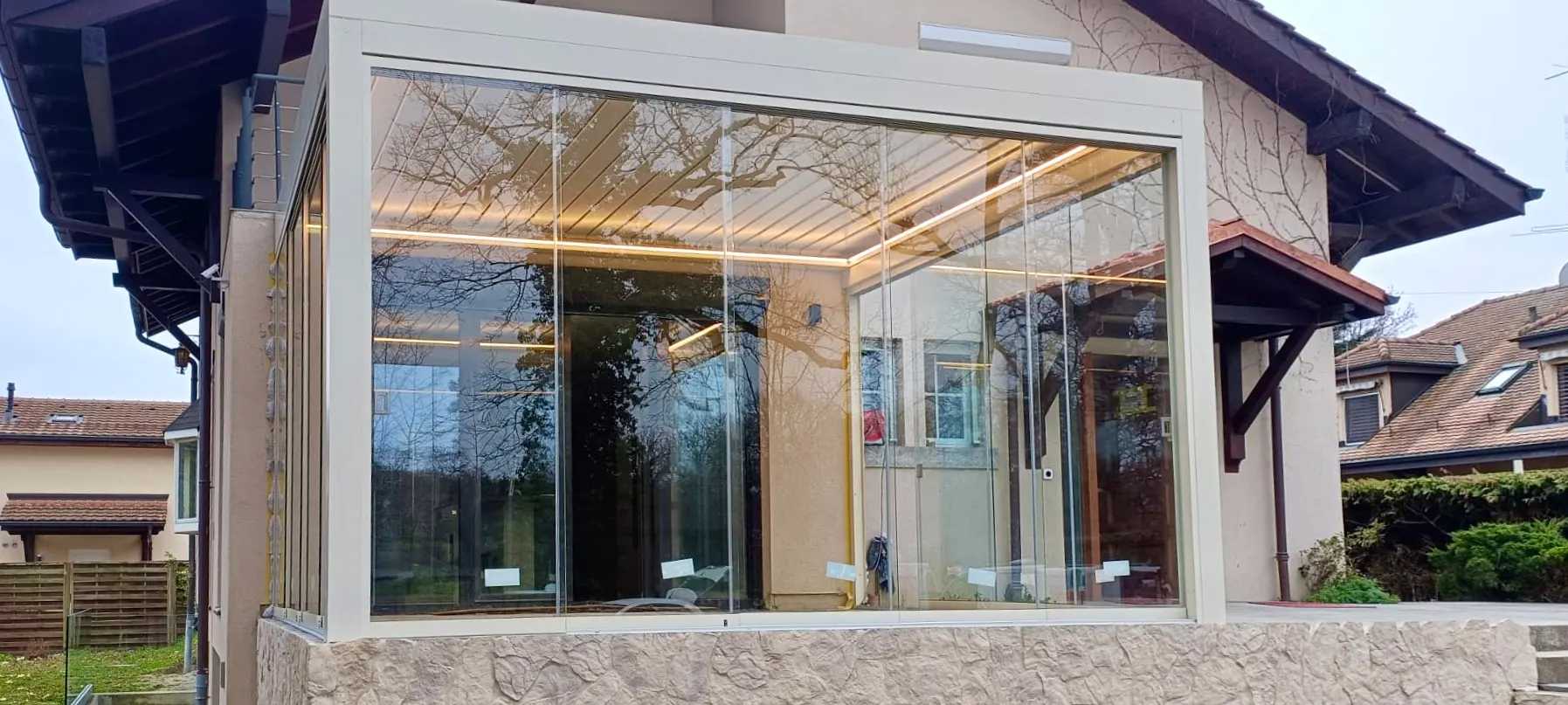 Retour en images sur l'installation de ce modèle bioclimatique à Genève. Une extension lumineuse sur terrasse avec fermeture par rideaux de verre.