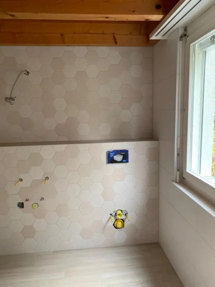 Découvrez la transformation complète d'une salle de bain à Corminboeuf par GoldenHome. Expertise en carrelage, sanitaires et finitions haut de gamme.